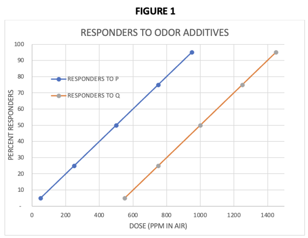 Well, let’s say you are the toxicologist asked to determine which of these substances would be best to use as the odor producing additive in storage tanks of an odorless, but flammable, gas that we’ll call gas “G”. For this gas you would want to be quite sure almost anyone (more than 95% of individuals) would be able to smell the additive at a concentration of “G” significantly below the concentration at which it explodes. We’ll call the explosion concentration “X”. So, you want gas “G”, with an additive in it, to be smellable at a concentration well below concentration “X” to allow gas users time to take corrective action to prevent explosions in case of any leaks. You and the gas “G” producer decide that a concentration of X/100 will allow sufficient time to take corrective action.