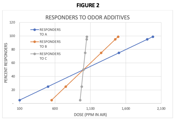 What additive do you recommend the producer use in this case? Would you recommend the odor additive for “G” be the substance with the low slope [“A”], the high slope [“C”], or the intermediate slope [“B”]?
